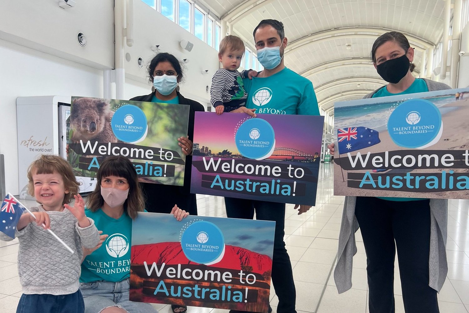 Pathway Club Co-Founder Derar Alkhateeb (centre) with TBB staff, preparing to welcome a new arrival at Sydney Airport.
